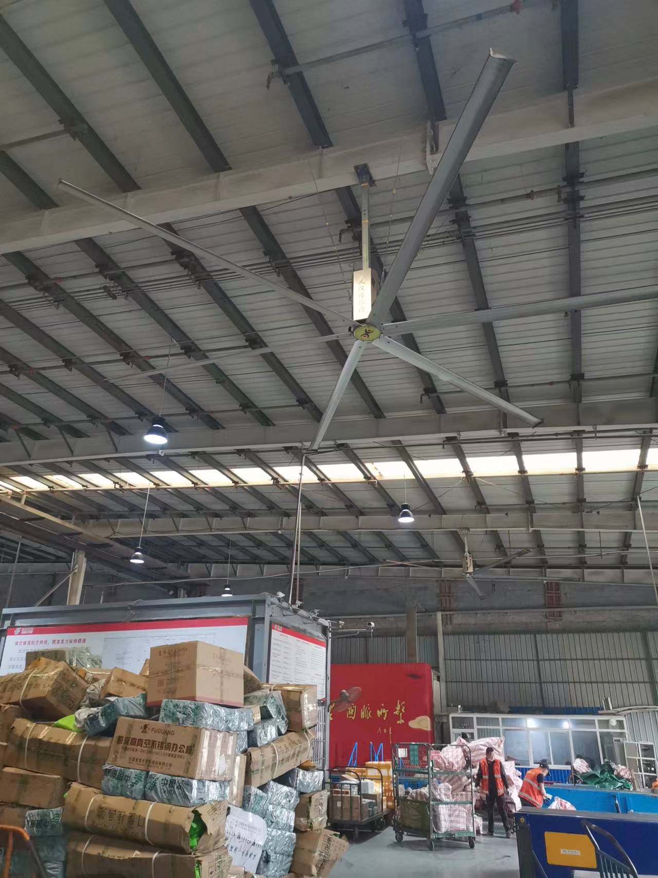 特色小镇建造在山顶上,设置有多个独立的大厅,面积多为800平方米左右,空间开放,游人多,不适宜安装中央空调,大型工业风扇的使用成为不二之选。既解决了通风降温的问题,同时也提高的特色小镇的辨识度。